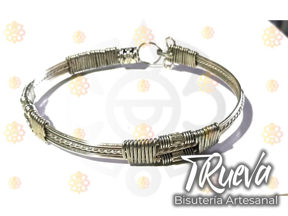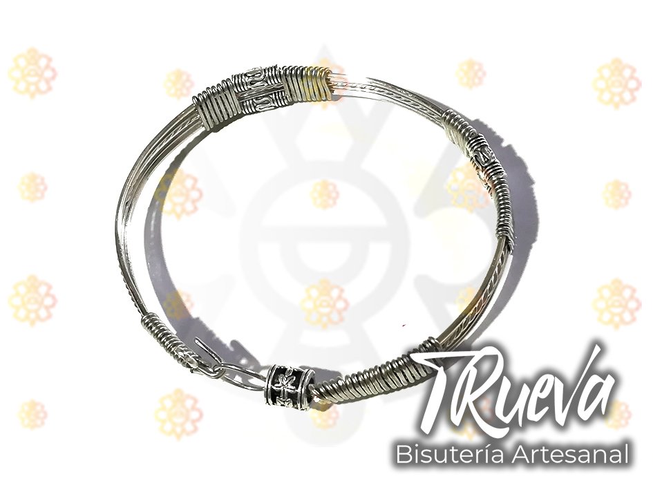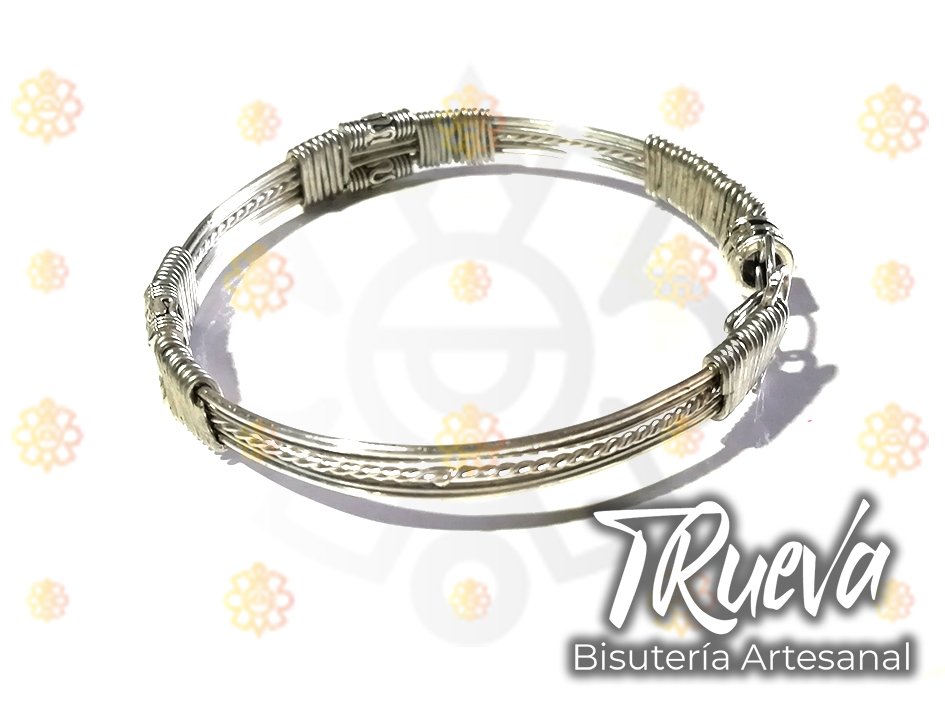 Brazalete TRueva con hilo central entorchado color plata con abalorios de tubo grabados.